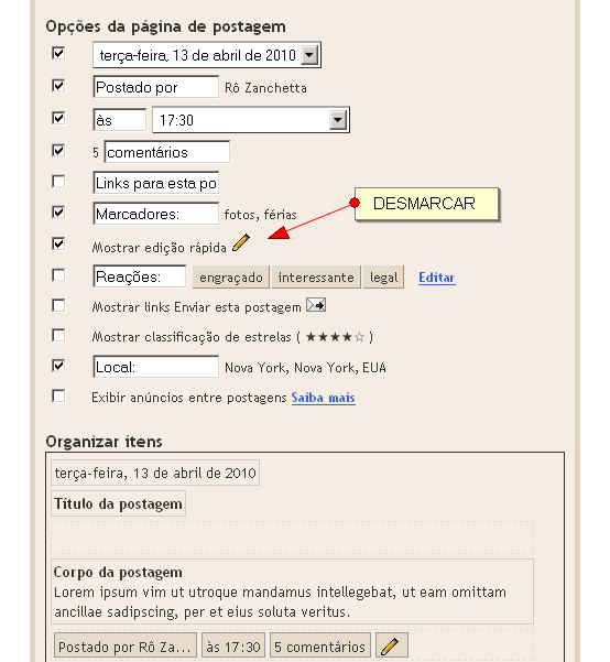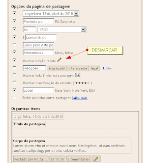 Como disse anteriormente, eu retiro a edição rápida de todos os meus widgets. Prefiro edita-los pelo painel "Elementos de Página". Isso ajuda muito a visualização quando estou alterando templates, principalmente nas páginas internas e previne intrusos em meus blogs.